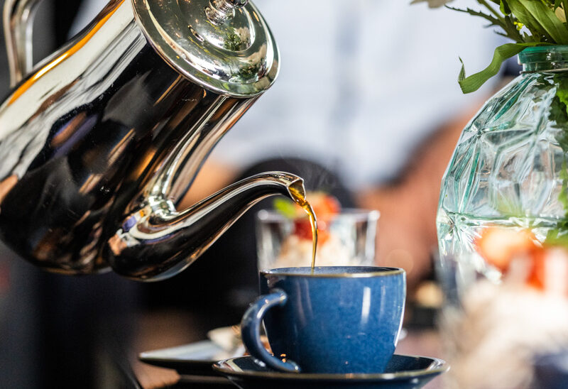 Interiøret er smakfullt og gjennomført, med møblar, lamper og kunst som harmonerer i varme, behagelege fargar. Det er noko heilt eige ved å sitje her og sjå lyset spegle seg i fjorden og fjella utanfor.